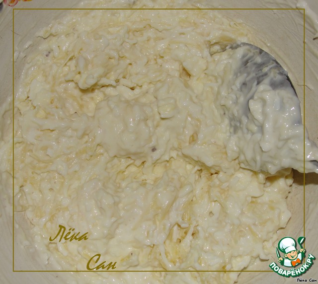 Вторую начинку делаем из натертых яйц, твердого сыра. Перемешиваем, добавляя дольку чеснока и майонез.