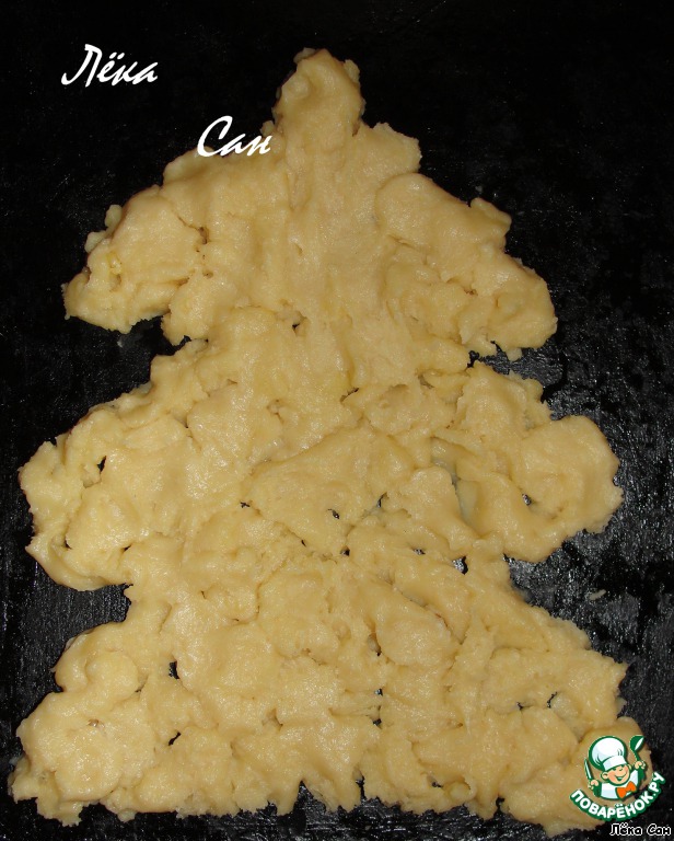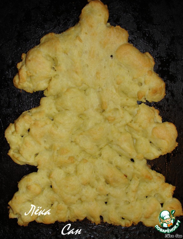 Сделать заварное тесто. Воду вскипятить, добавить маргарин. Заварить муку, дать немного остыть и вбить по одному яйца. Вымешивать ложкой до гладкости. Выложить на противень в форме елочки и выпекать до готовности.