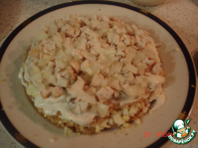 С каждого коржа оставляем по ложке (яиц, грудки с луком, ананаса, это все перемешаем с майонезом).