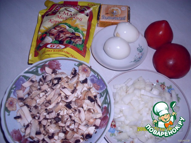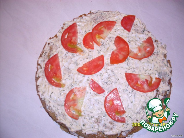 3 слой опять сырно-яичная. Сверху укладываем дольки помидор.