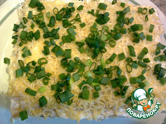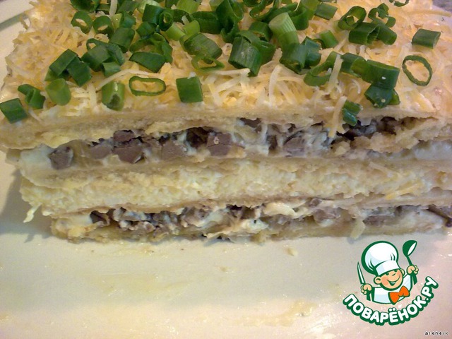 Коржи можно испечь заранее, но начинку укладывать не позднее, чем за ночь, чтобы хорошо пропитался. Перед подачей на стол посыпать натертым на мелкую терку сыром и зеленым луком