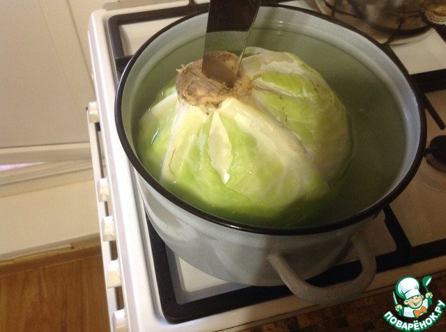 У капусты удалить наружные листья. Разобрать кочанчик на листья. Капуста оказалась деревянная, пришлось немного поварить.