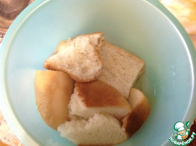 Хлеб отжать и перемешать с репчатым луком, мясным фаршем, лимонной цедрой (1 чайная ложка), 1 яйцом, специями, солью.