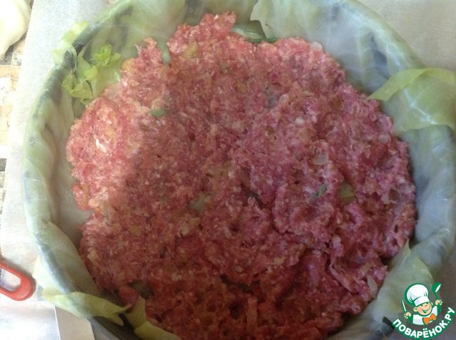 Форму для запекания или разъемную форму для торта (у меня разъемная форма) застелить пекарской бумагой (чтобы она не протекала) и смазать сливочным маслом. Попеременно слоями выложить в нее капусту, фарш. В первом слое на борта формы тоже положите капусту. Листочки должны свисать.