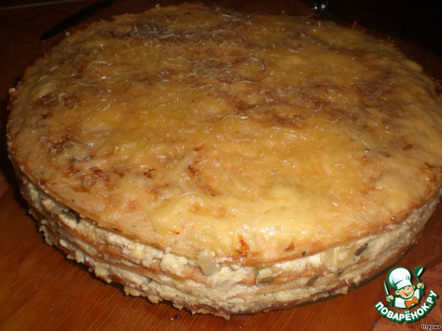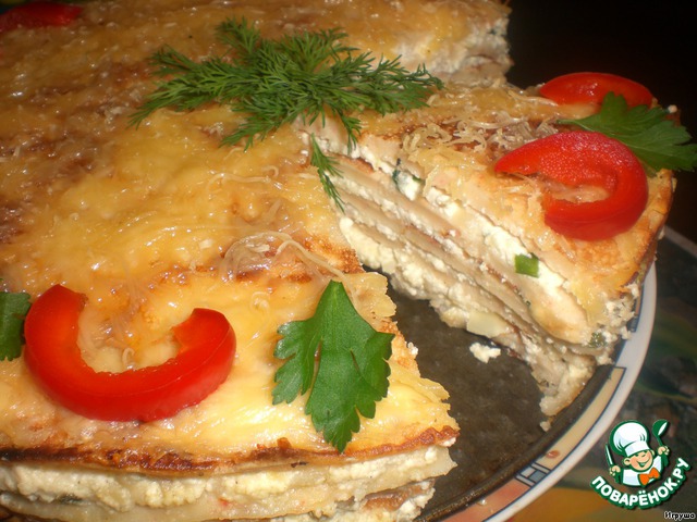 | Ну, любители творога, налетайте! Ароматные блинчики с паприкой и базиликом создают основу торта. А начинка-творожная. Очень вкусен тeплым. |