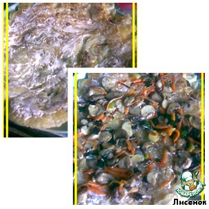 Готовые грибы соединить с луком и морковкой. Это и есть наша начинка для торта.