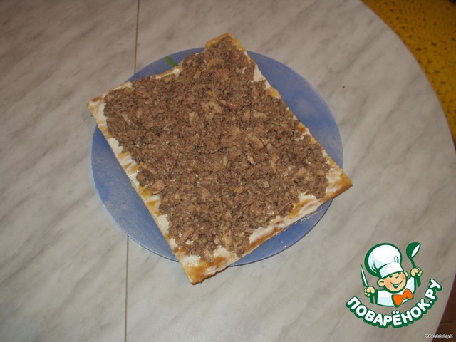 На первый корж выкладываем, размятые вилкой, рыбные консервы (у меня сайра)