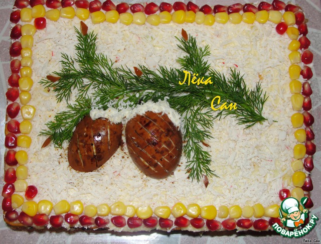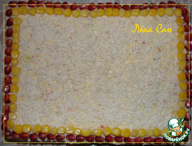 У замороженных крабовых палочек срезать розовый слой и сразу натереть на мелкой терке, посыпать ровненько сверху. По краям выложить зерна граната и кукурузу.