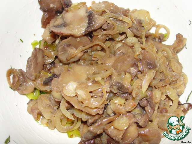 Для второй начинки шампиньоны пожарить с нарезанным репчатым луком.