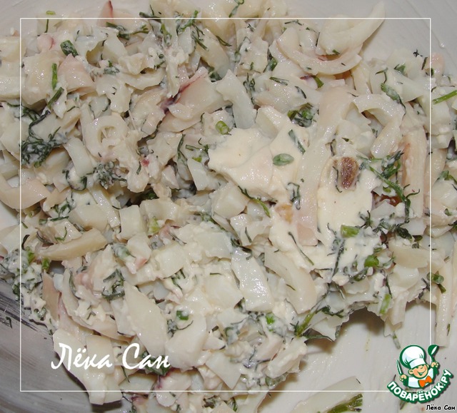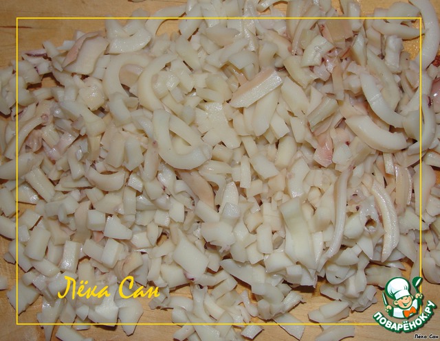 Кальмары почистить, отварить в течение 1-2 минут, посолить. Дать им немного остыть, мелко нарезать или пропустить через мясорубку.