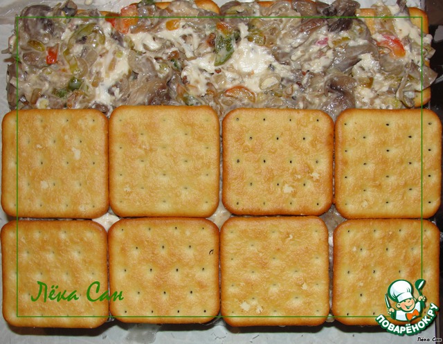 Накрыть вторым рядом крекеров и выложить грибную начинку, и