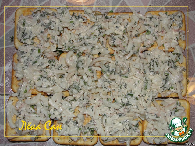 Выложить 12 крекеров в форме прямоугольника, сверху положить кальмаровую начинку.