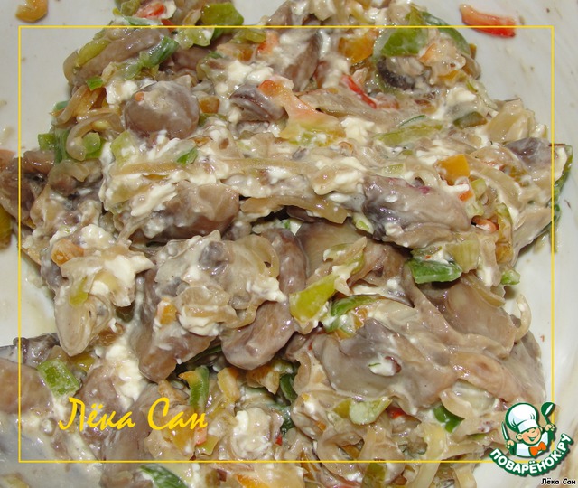 Соединить перец с грибами, заправить мягким сыром и перемешать. Это вторая начинка.