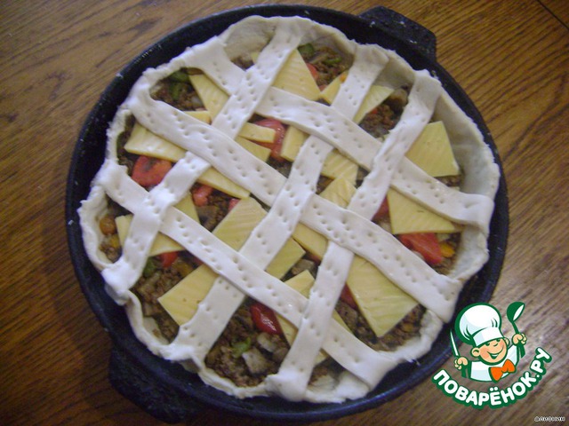 Оставшееся тесто порезать полосками и украсить ими пирог в виде решетки.Сверху смазать яйцом.