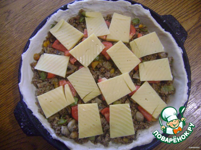 Три пластины теста сложить в один ряд и раскатать.Форму сполоснуть холодной водой и выстелить тестом.Выложить начинку.Помидоры и сыр нарезать кусочками и разложить поверх пирога.