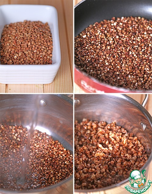 Для начала нам нужно приготовить гречку. Для этого прокаливаем крупу, помешивая, на среднем огне около 5 минут - она будет забавно шевелиться и вести себя примерно как попкорн, разве что не выпрыгивать))