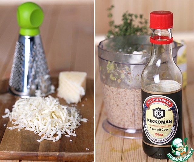 В блендер засыпаем сварившуюся гречку, добавляем яйца, тертый сыр, тимьян или другие травы по Вашему вкусу, столовую ложку соевого соуса - пюрируем. Далее наливаем сливки, сколько возьмет для средней жидкости теста. У меня ушло около 100мл.