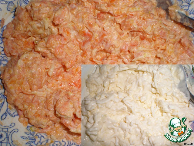 Приготовить начинку.Морковь натереть и добавить чеснок с майонезом,перемешать.Сыр тоже натираем,добавляем чеснок и майонез.