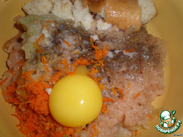 В фарш добавить замоченный в сливках батон,яйцо,цедру,соль и перец.