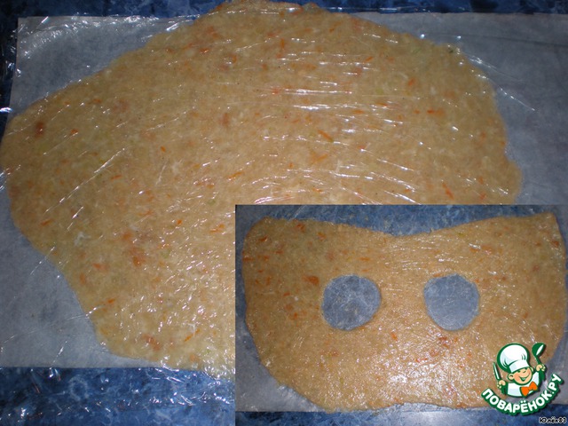 На пекарной бумаге раскатать кусок фарша накрыв пленкой.Раскатывать тонко (корж хорошо снимается если его перевернуть бумагой вверх.) С помощью трафарета вырезать маску.Оставшийся фарш собрать и раскатать еще раз (и так пока не закончится).
