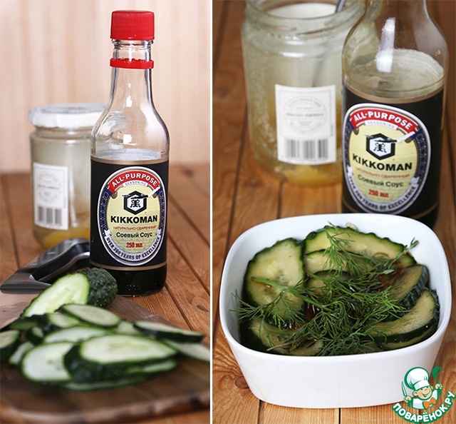 Огурцы нарезаем довольно тонкими ломтиками, заливаем 2 ст. л. соевого соуса и кипятком, добавляем мед, перемешиваем (можно добавить несколько веточек трав по вкусу, я добавила немного тимьяна и укропа) и убираем в холодильник на сутки.
