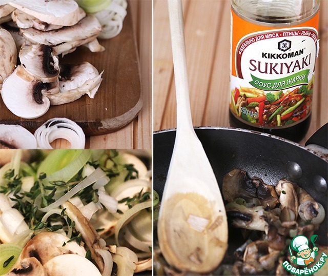 Теперь, незадолго до приготовления самого бутербродного торта, нам нужно приготовить грибной слой. Для этого грибы и порей режем тонкими ломтиками/колечками и выпариваем на сковороде с добавлением тимьяна и 1 ст. л. соевого соуса Kikkoman Sukiyaki.