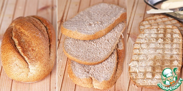 Нам нужно обрезать верхнюю и нижнюю корку, за тем разрезать буханку на 3 части, среднюю часть обжарить на гриле с двух сторон, верх и низ с одной.