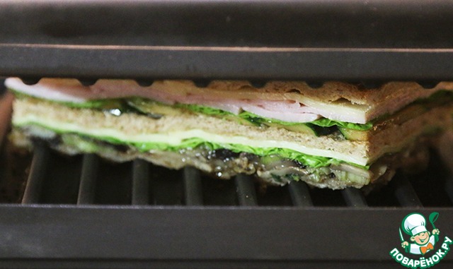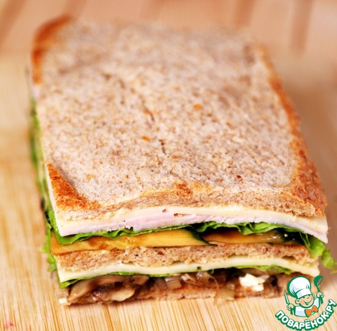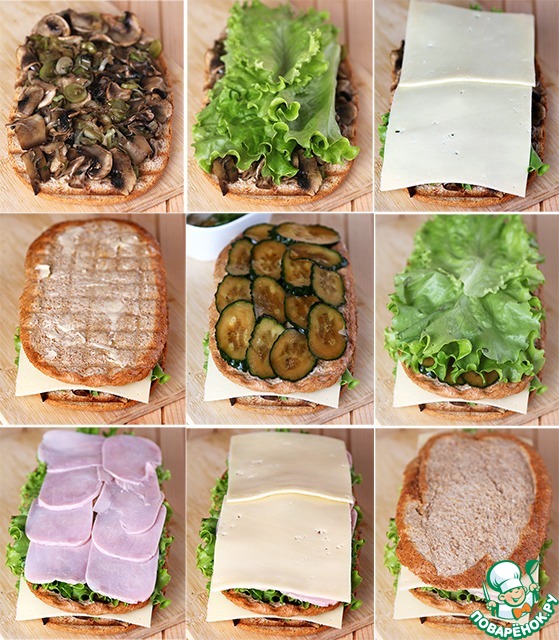 Собираем торт: на нижнюю часть хлеба укладываем грибы (тут я дала маху, лучше еще положить под грибы слой салата), далее салат, сыр, промежуточный хлеб (который обжарен с двух сторон). Следом идут домашние малосольные огурчики, ветчина, сыр и верхний хлеб. В общем уже красиво)) И вкусно. Можно прямо в таком виде сунуть торт-бутерброд в духовку, разогретую градусов так до 200-220, а можно пойти дальше)