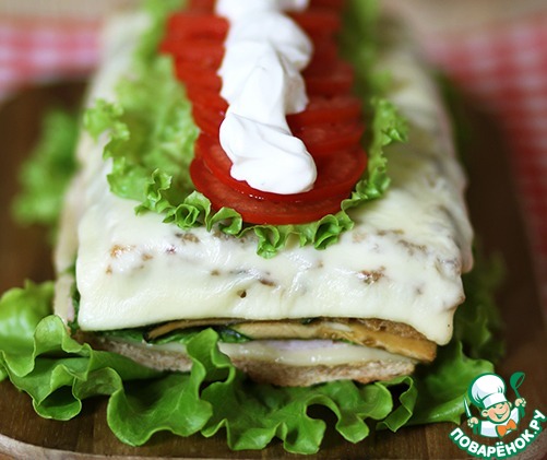 После этого можно уложить торт-бутерброд на листья салата, украсить помидором и сметаной и подать к столу.