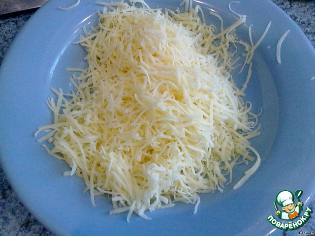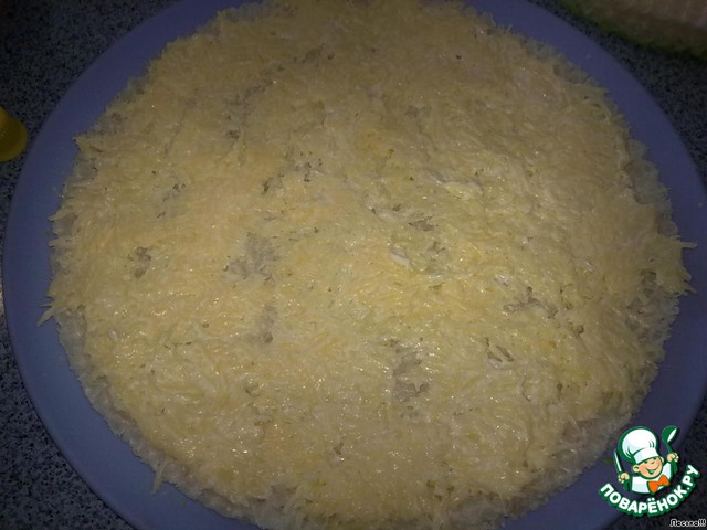 Накрываем коржом. Второй слой будет сырный. Сыр твердый трем на мелкой терке.