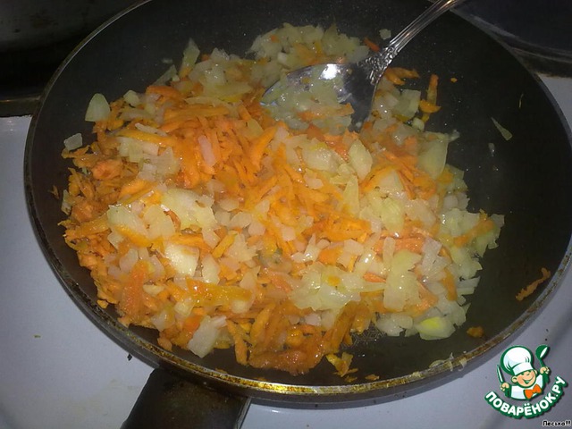Морковь с луком очищаем, измельчаем и обжариваем в масле до золотистого цвета.