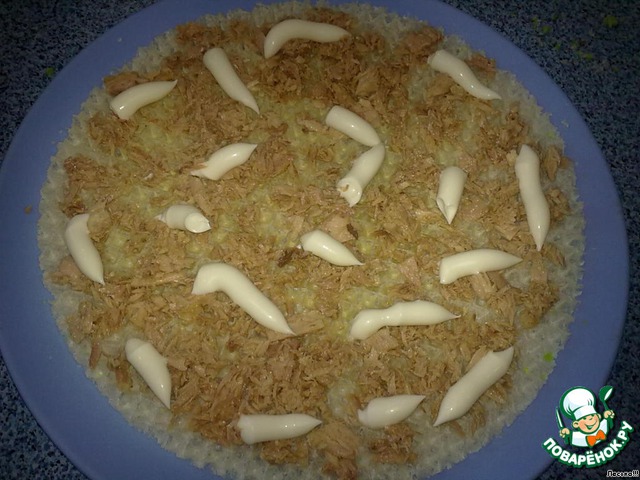 Следующий слой снова рыбный, и снова немножко майонеза.