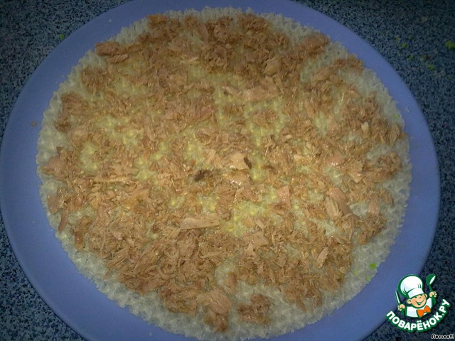 Первый слой у меня был рыбный. Рыбу (тунца) разминаем вилочкой и половину выкладываем тоненько на первый корж.