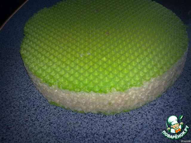 Были у меня вафельные коржи, вот их я и решила приспособить для своего тортика. Вот такие, как раз с зеленым верхом, вот удача:-)