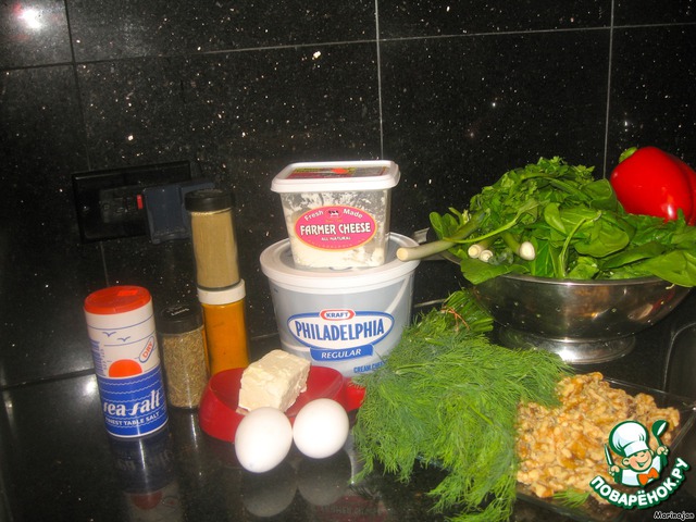 Добавить молотый орех, риккоту (или творог), сыр Филадельфия, яйца, мелко нарезанную кинзу и зеленый лук,на кончике ножа соду и 2 столовых ложек муки.