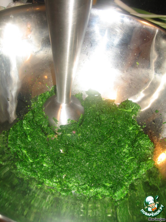 Отварить шпинат в подсоленной воде 1- 2 минуты, перекинуть на сито и сразу обдать холодной водой (для сохранения цвета).