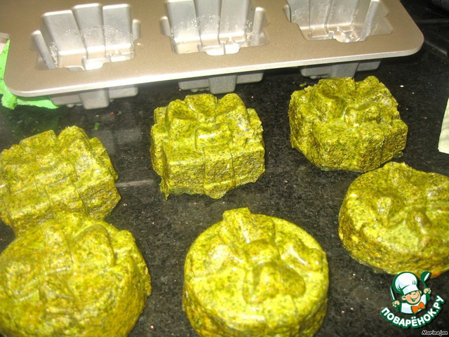 Теперь заполняем формочки: слой шпинатной кашицы, 1 ч. л. кашицы перца и в каждую я добавила по ягодке клюквы, а в одну кусочек желтого перца.