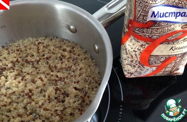 Тщательно промываем киноа. Крупа может горчить, так как семена покрыты слоем сапонинов, поэтому её лучше замочить на несколько часов и промыть, прежде чем готовить. Заливаем водой 1:2, доводим до кипения и варим на медленном огне 15 минут.