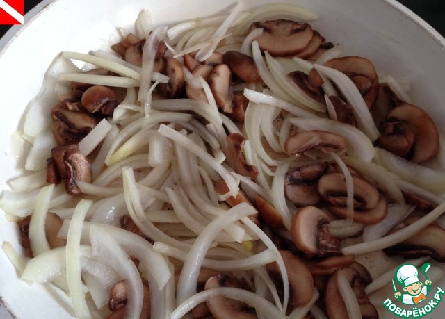 Тем временем приступим к приготовлению начинки. Шампиньоны и лук режем, обжариваем до готовности лука на оливковом масле.