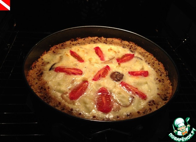 Переливаем начинку в подготовленную форму, сверху раскладываем дольки помидоров черри
