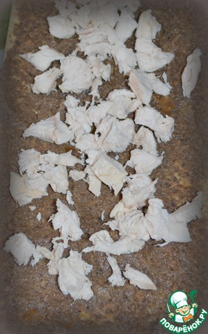 Намазываем на один корж грибную массу, выкладываем курицу. Можно смазать майонезом. Сверху кладем второй корж.