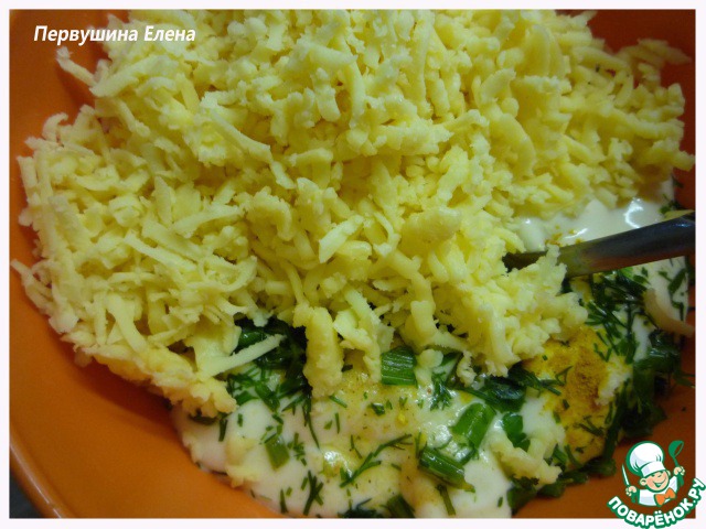 Тертые на крупной терке яйца и хорошо перемешиваем.