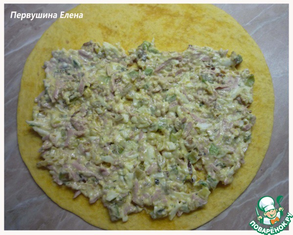 Кладем 6-й лаваш, так же намазывая на него начинку и аккуратно, волшебными пальчиками переворачиваем вверх ногами обработанные 5-ым лавашом рулетики.