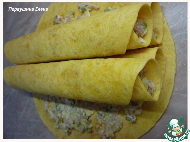 Накладываем начинку на кружок лаваша, оставив примерно 3 см пустыми, иначе при скручивании начинка вылезет. И скручиваем в рулетики. Стараемся это делать потуже. Делаем таких рулетов 4 штуки.