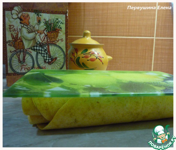 Проделываем те же маневры, а именно, заворачиваем концы к середине, туго натягивая лаваш. И прижимаем чем-нибудь тяжелым (у меня стеклянная разделочная доска), и даем настояться минимум пол часа, иначе при разрезание он расползется.