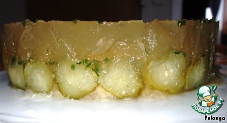 Корж переложить в форму побольше (фольгу снять). Края выложить кружочками соленых огурцов. Залить сверху бульоном и поставить на холод до застывания. Аккуратно перенести торт на тарелку.