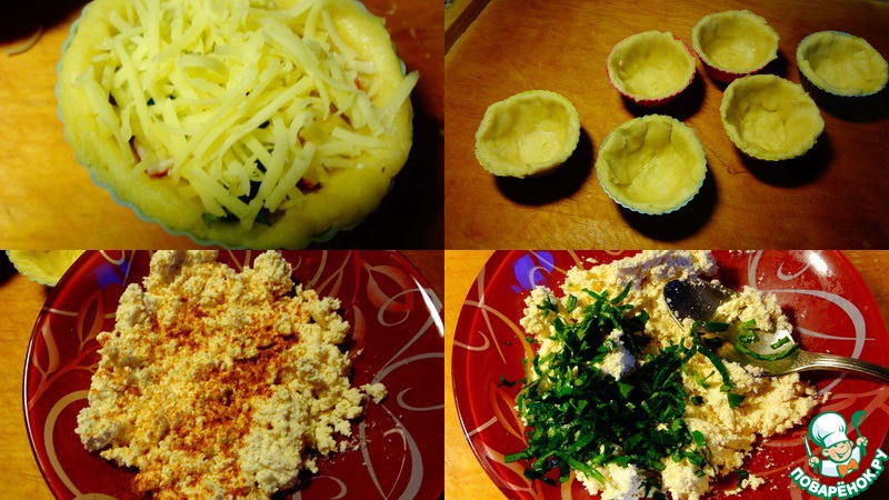 Сыр ( у меня была"Фета" ) растереть и добавить к нему щепотку красного острого перца и порезанной петрушки (можно положить любую зелень).