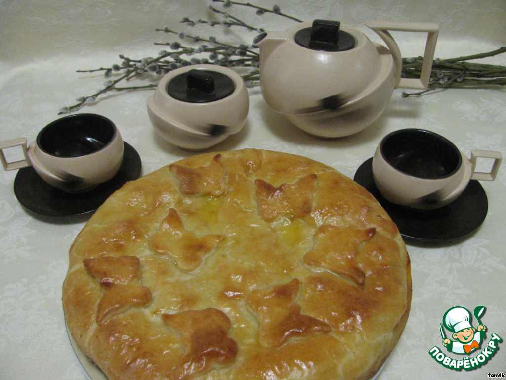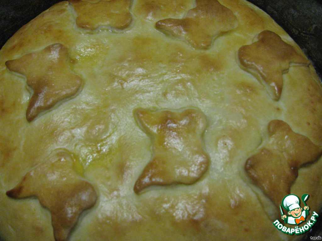 13. Накрываем оставшимся тестом пирог. Можно украсить и смазать желтком + 1 ст.л. молока. Наколоть вилкой.