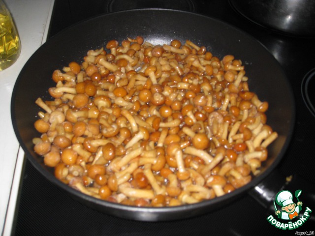 2. Опята, не размораживая, поставить жариться на большой сковороде, периодически помешивая.