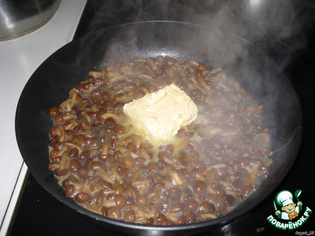 4. К этому времени грибы как-раз отлично потушились, лишняя жидкость испарилась, добавляем сливочное масло (100 г).